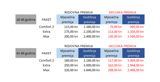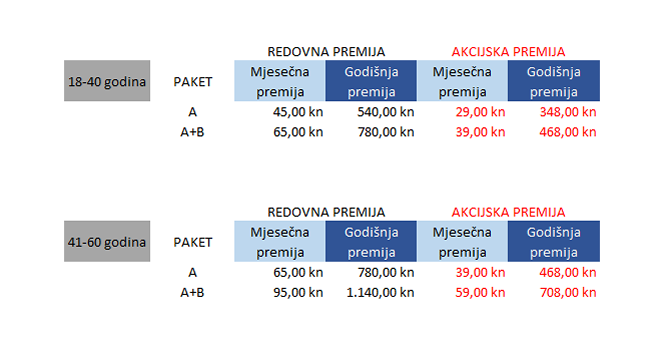 Ovisno o ugovorenom paketu i dobi osiguranika, vrijedit će slijedeće premije: